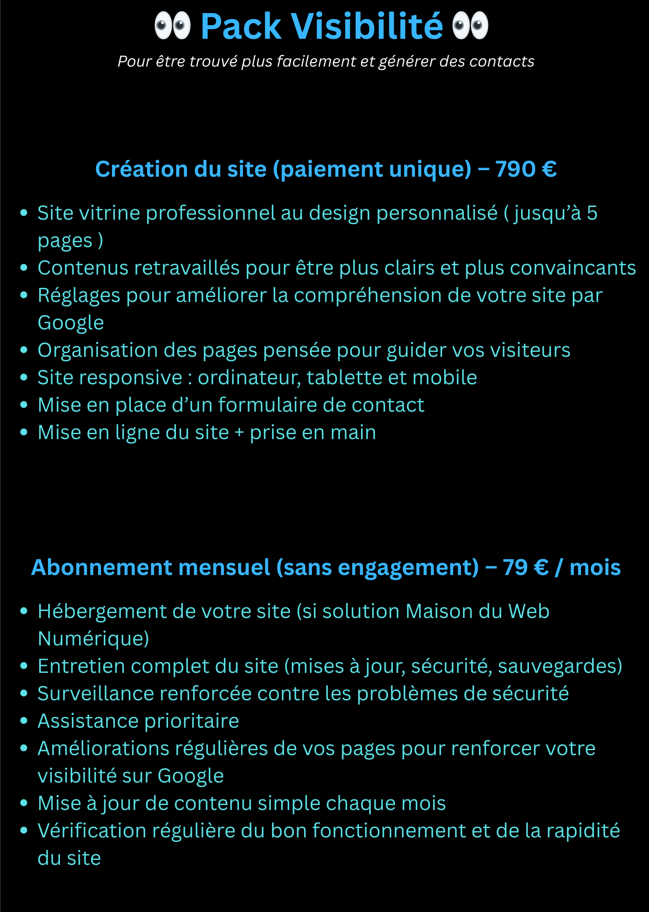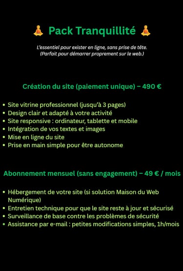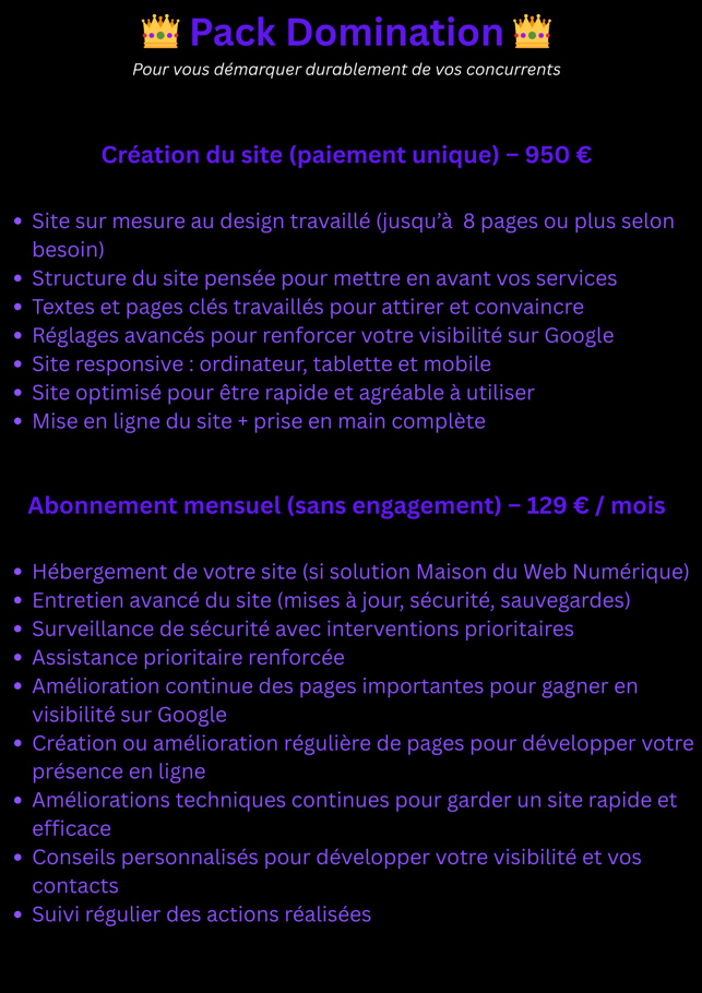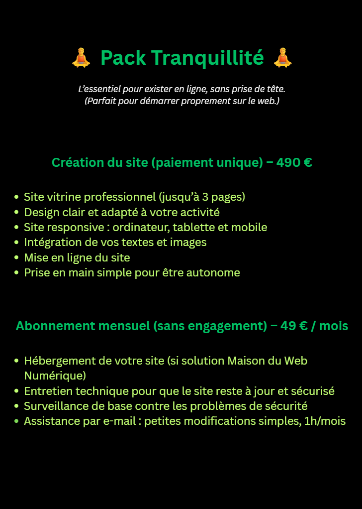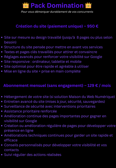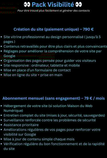Les services proposés par Maison du Web Numérique concernent des prestations numériques, la création de sites internet, l’optimisation web ainsi que des abonnements mensuels incluant maintenance, hébergement, accompagnement ou services digitaux.
